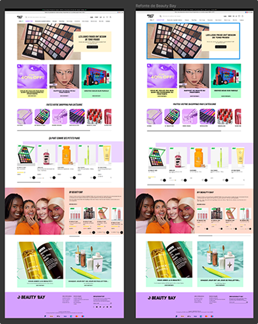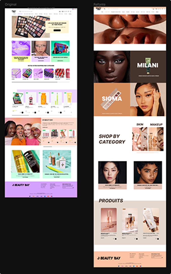 Lors de nos premier cours de UX/UI design nous devions en binôme réaliser la refonte d’un site de notre choix, tant qu’il contenait suffisamment d’éléments pour que ce soit pertinent. De plus, notre refonte devait s'éloigner du graphisme original du site web. Ainsi avec mon binôme Adelina Ashani, nous avons choisi le site de BEAUTY BAY.