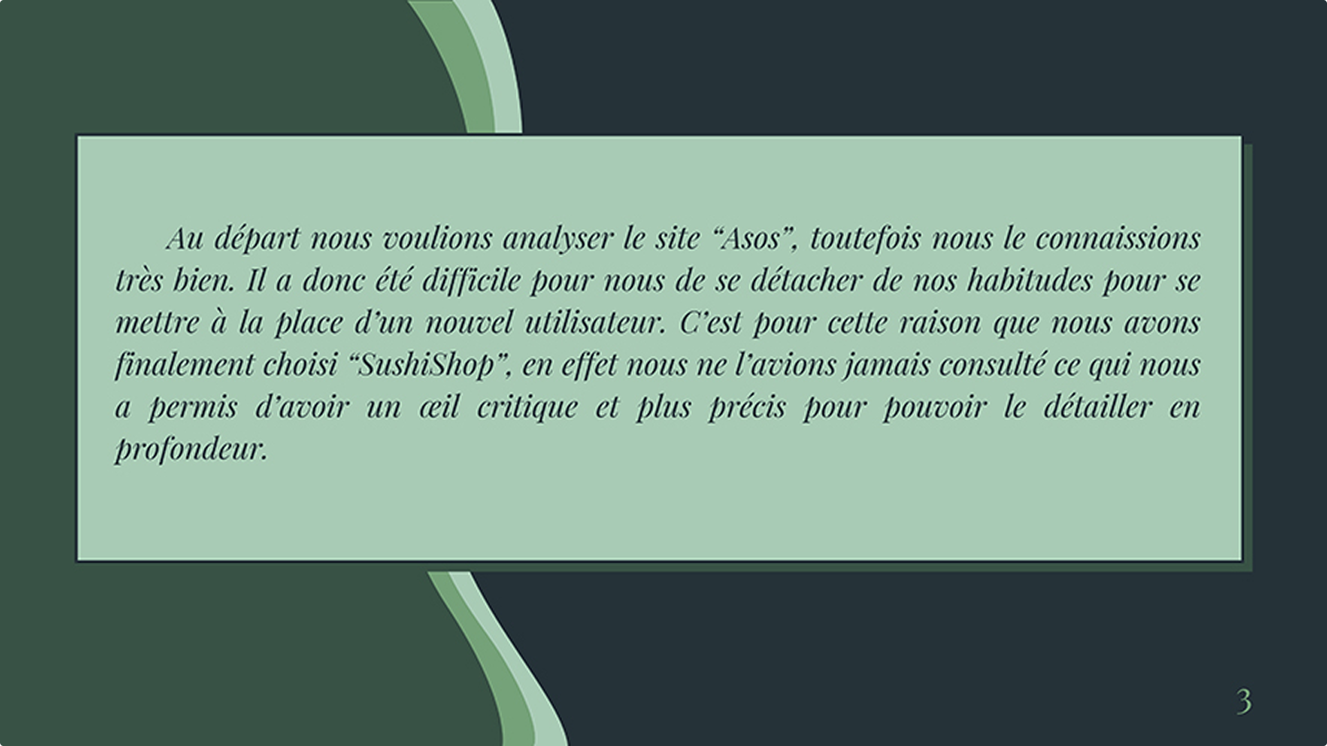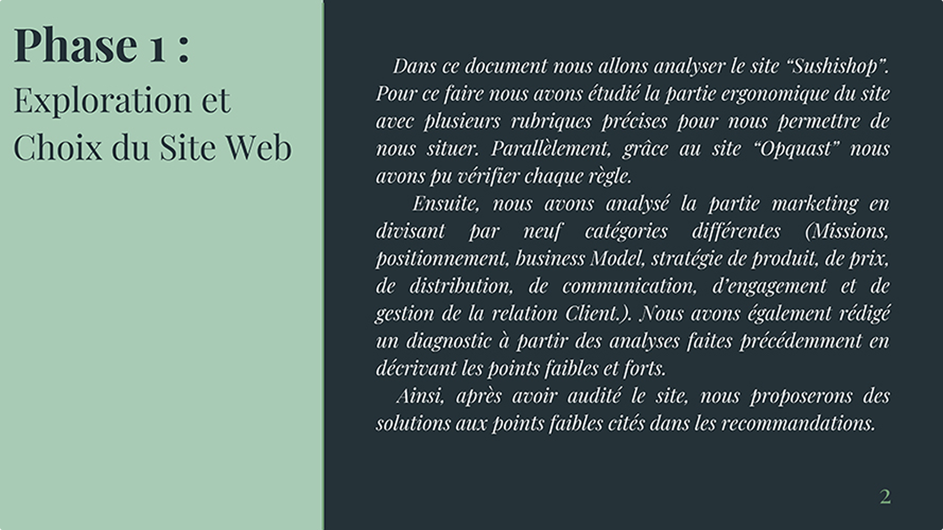 Nous devions, avec ma camarade Rihab Bouazzaoui, réaliser un audit d’ergonomie et d'accessibilité et une analyse marketing du site web Sushi Shop. On a examiné différentes facettes de ce site, telles que les choix sémantiques, l'accessibilité et son ergonomie.